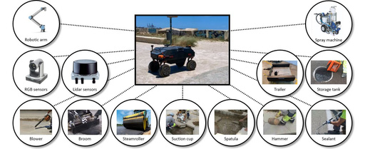 • Diverse robotic equipment, including sensors and actuators (tools for cutting and filling, placing and compacting surface materials, installing modular components, laser scanners for 3D mapping) embedded on the main vehicle;