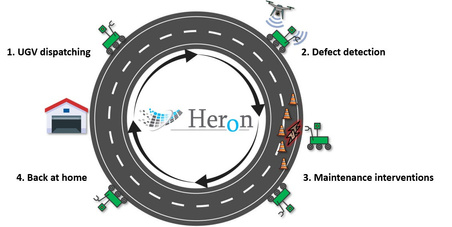 HERON proposes an unified automated system along with an independent ground robotic vehicle designed for maintaining road infrastructures complemented by autonomous drones for coordination with exchange infrastructure data to enhance user safety. An extensive database is currently being constructed to enhance potential anomaly detection performance. Deep learning detectionalgorithms are alreadyshowingpromisingresults.